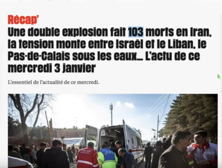 Maintenant, regardez cette news : « Une double explosion fait 103 morts en Iran, la tension monte entre Israël et le Liban, le Pas-de-Calais sous les eaux… L’actu de ce mercredi 3 janvier »