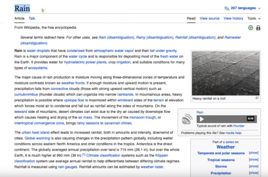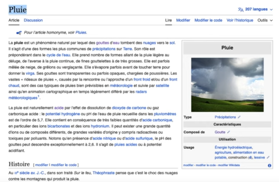 Sur la page Wikipédia dédiée à « PLUIE », on trouve des informations dans 207 langues différentes.