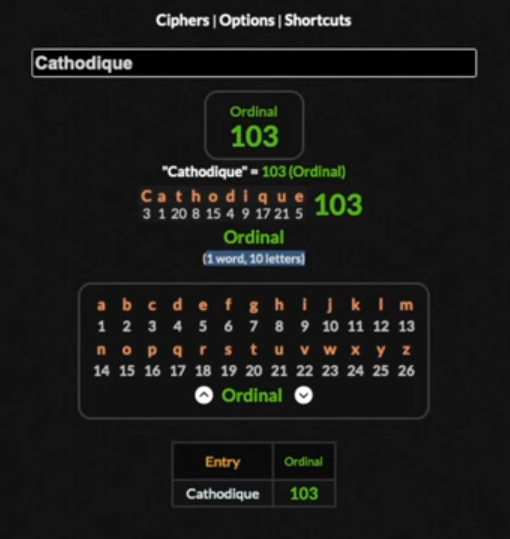 C’est pourquoi le mot « cathodique » donne également le nombre 103 en utilisant une certaine méthode « ordinal ».