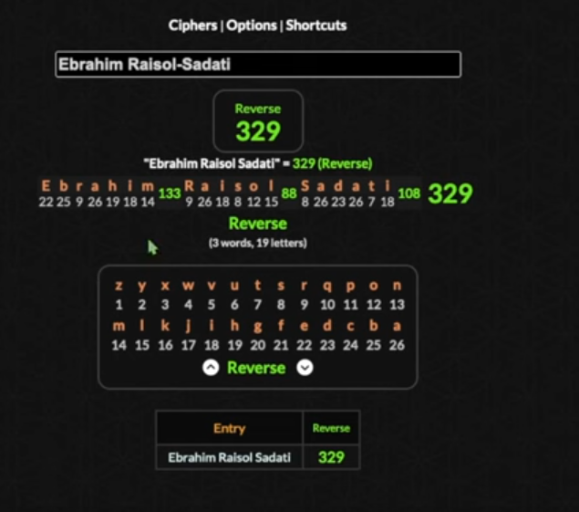 Si nous regardons son nom complet, « Ebrahim Raisol Sadati », il correspond à 329 en « reverse »