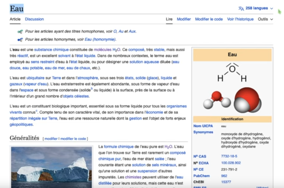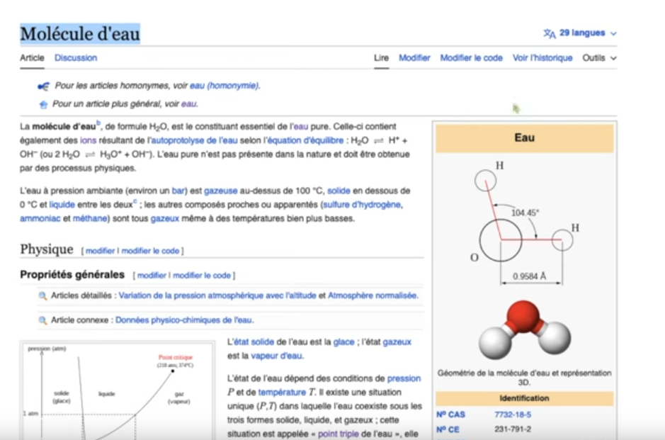 Ce qui peut être associé à la molécule d’eau, qui est décrite dans 29 langues sur Wikipédia.